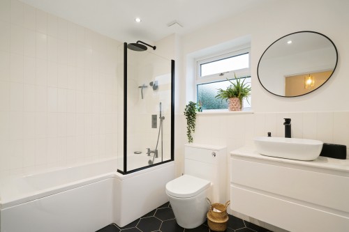 The bathroom is cool and elegant, with a modern sleek design, L-shaped bath (with overhead rain shower), a decent size vanity sink storage unit and WC.