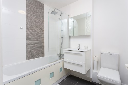 - Well presented Bathroom suite with bath, overhead rain shower, vanity unit, illuminated mirror light, sink and WC